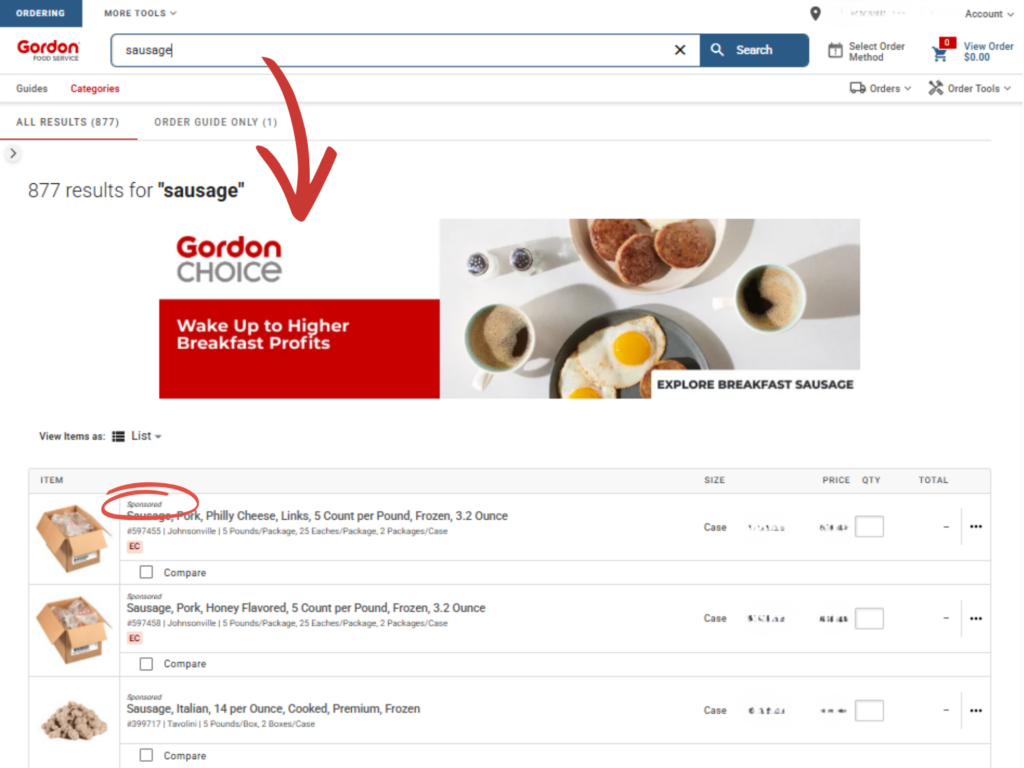 Sponsored search ads consist of branded banners and/or individual items within the Gordon Ordering platform. Banner ads are designed with a logo, call-to-action, and a picture. Material ads are individual SKUs that are pushed to the top of the search results page. These ads are delivered to customers based on a specific keyword that is searched, and will only show for the keywords they are intended for.